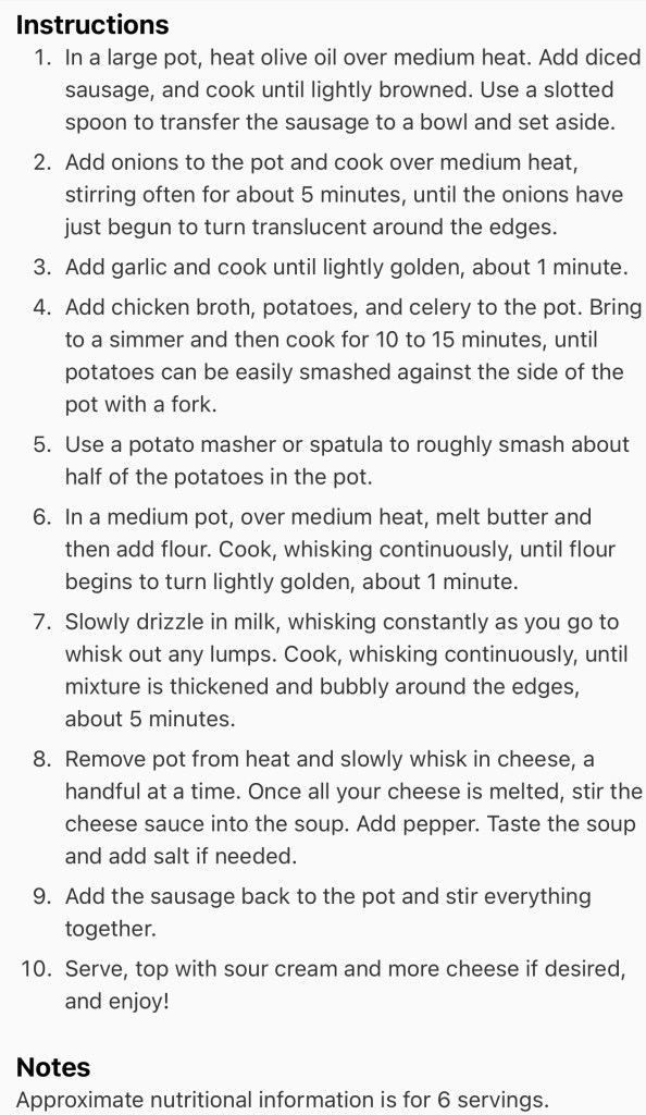 I followed Baking Mischief’s recipe… doubled it and added more potatoes and smashed them to make it a little less soupy (since husband doesn’t like soup).